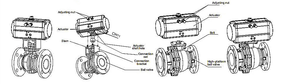 সাধারণত, অ্যাকুয়েটর এবং বল ভালভের সমাবেশ একটি বন্ধনী এবং সংযোগ সেট ব্যবহার করে করা হয়। বিকল্পভাবে, বায়ুসংক্রান্ত অ্যাকুয়েটরের শ্যাফ্টের গর্তে বিশেষ স্টেম ঢোকানোর মাধ্যমে এগুলিকে একত্রিত করা যেতে পারে। নিশ্চিত করুন যে টাকু নাক অ্যাকচুয়েটরের শ্যাফ্ট গর্তের বাইরে প্রসারিত না হয়, কারণ এটি জ্যামিংয়ের কারণে ত্রুটির কারণ হতে পারে। সমস্ত সংযোগকারী অংশ উচ্চ সমাবেশ নির্ভুলতা থাকতে হবে; অন্যথায়, খোলার বা বন্ধ করার কোণে পরিবর্তন ভালভ ফুটো হতে পারে। অংশগুলির সমাবেশ সহনশীলতা প্রাসঙ্গিক মান মেনে চলতে হবে। শ্যাফ্ট হোল (স্টেম), বর্গাকার গর্ত এবং স্লটের টাকু নাকের সহনশীলতা হল H11/d11, গ্রেড 9 জ্যামিতিক সহনশীলতায় সমান্তরালতা এবং প্রতিসাম্য সহ।