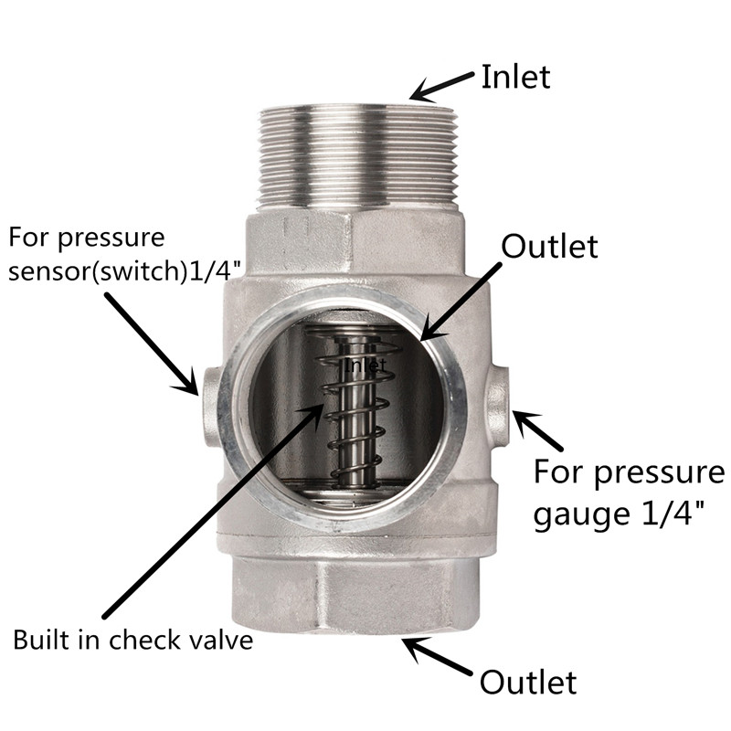 ইন্টারফেস: 1-ইঞ্চি মহিলা পোর্ট (ওয়াটার ইনলেট), 1-ইঞ্চি পুরুষ পোর্ট (ওয়াটার আউটলেট), আরেকটি 1-ইঞ্চি মহিলা পোর্ট (একটি চেক ভালভ সংযোগ করার জন্য), 1/4-ইঞ্চি মহিলা পোর্ট (একটি চাপ সুইচ সংযোগ করার জন্য), 1/4-ইঞ্চি পুরুষ পোর্ট (একটি চাপ গেজ সংযোগের জন্য)।