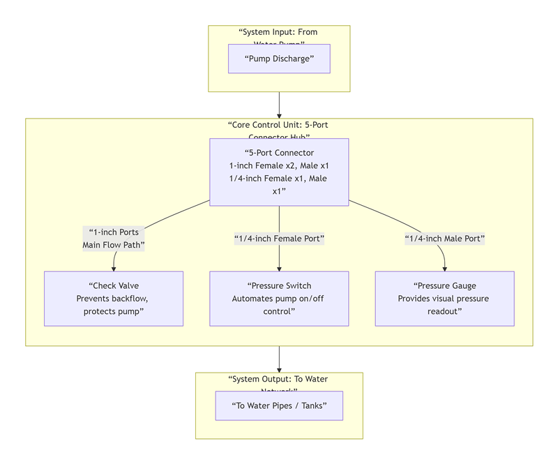 পাঁচ-উপায় সংযোগকারী: সিস্টেমের মূল কাঠামো, সমস্ত উপাদানকে একটি সম্পূর্ণরূপে সংযুক্ত করে, পাইপ জয়েন্টগুলিকে ন্যূনতম করে এবং ফুটো হওয়ার ঝুঁকি হ্রাস করে।